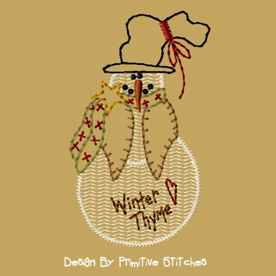 PS-314-Winter Thyme Snowman-4x4-CW4 x 4 Inches-$4.002.31" X 3.91"3385 Stitches8/8 ColorsFormats Included in Zip File:DST, EXP, HUS, JEF, PES, VIP, XXX, SEW, VP3, EMD, CSD, PCSEmbird Color Palette File IncludedArtwork & Digitized by: Rhonda Bowers of Primitive Stitches"Copyright" Primitive Stitches 2019All Rights Reserved